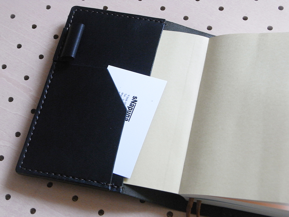 見開き左にポケットがあり、A4の四折りメモや名刺などを収納できます。