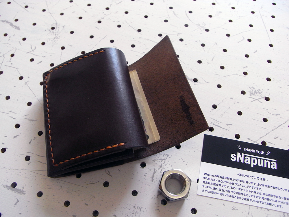 sNapunaの革製品は、断裁から穴あけ、縫いまで、全て手作業で製作していますので、作業中に仕方なくつくシワや小傷が入ることがございます。