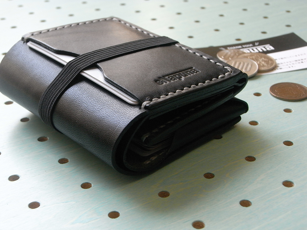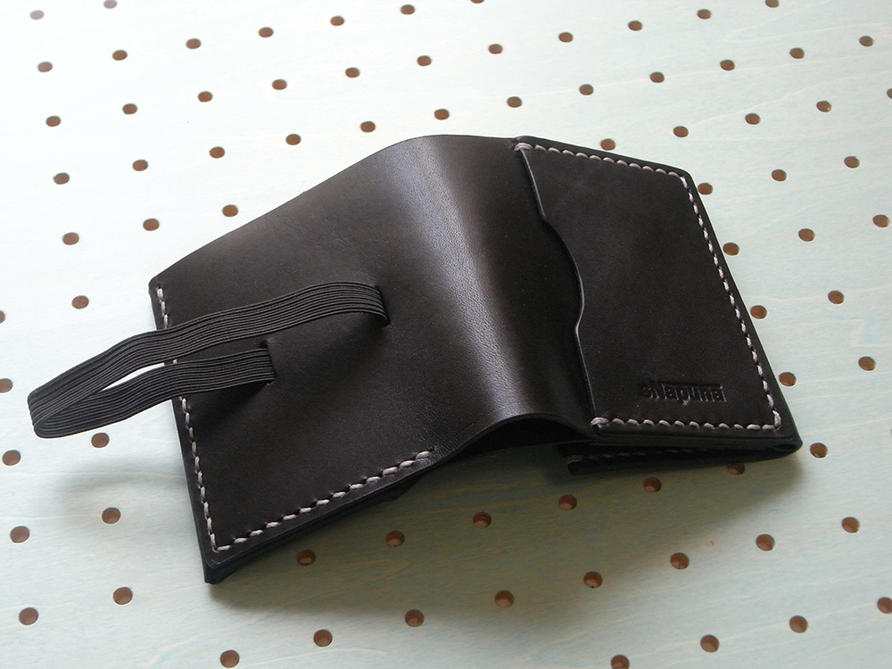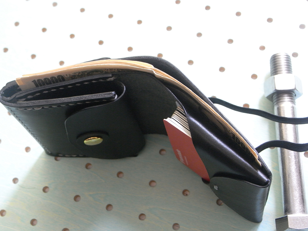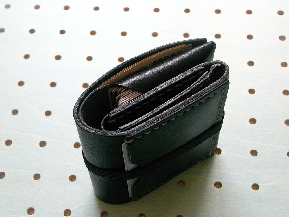 財布全体はゴムバンドを使用しています。これは収納量に応じて「ピシッ!」と閉じるように考えてです。